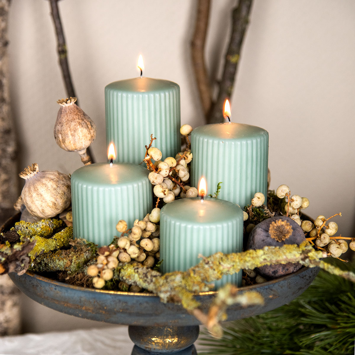 Het koele, lichte smaragdgroen maakt de grote stompkaarsen tot het hoogtepunt van een kerstdecoratiearrangement en natuurlijk ook op de adventskrans met ijzige decoraties.