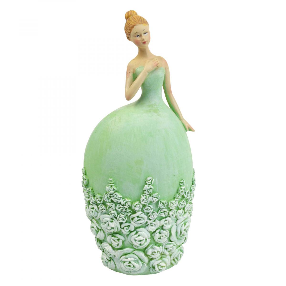 Als tafeldecoratie voor de lente betovert deze decoratieve figuur van een vrouw met haar gratie. De groene baljurk van de dame is versierd met witte, plastisch vormgegeven rozen.Het onderlichaam van de decoratieve figuur is sterk gestileerd en doet denken aan een smalle antieke amfora. Het figuur voor de tafeldecoratie bestaat uit polyresin (kunststeen) en is zorgvuldig beschilderd tot in de details zoals lippenstift en rouge.