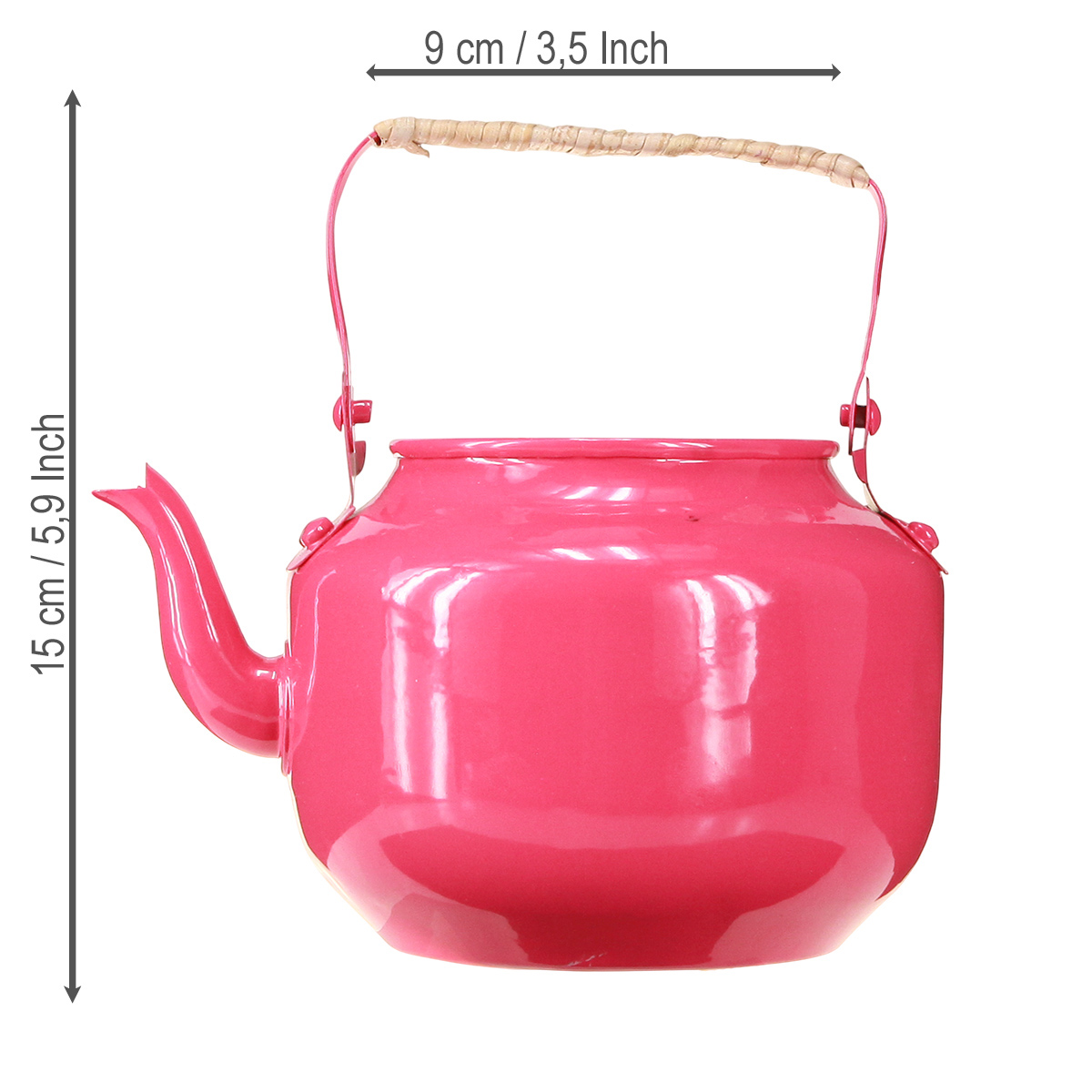 Waarom juist deze theepot? Dankzij het handzame formaat van 15 cm hoog en 11 cm in diameter is het een veelzijdig object dat zowel decoratief als praktisch is. De roze kleur is fris en vrolijk, maar toch klassiek genoeg om niet te overheersen. Het robuuste metalen materiaal garandeert duurzaamheid en stabiliteit, terwijl het rustieke handvat met bamboe details perfect past bij de landelijke uitstraling.