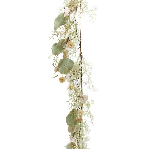 Deze kunstslinger met sierdistels, bladeren en ranken is een sfeervolle wanddecoratie. De kunstplant maakt indruk met zijn filigrane vertakkingen, de realistische details en de kleine boldistels.Hang- en klimplanten zijn altijd een mooi gezicht en onderdeel van een prettige leefomgeving, maar ze moeten wel constant water krijgen. Deze decoratieve guirlande is gemakkelijk te onderhouden, waardoor je je leefruimte makkelijker kunt inrichten met groene planten. De hele slinger wordt bij elkaar gehouden door een stevige metalen draad. Aan beide uiteinden zitten draadogen zodat de decoratieve slinger gemakkelijk kan worden opgehangen. Met extra exemplaren kunnen de slingers ook aan elkaar worden geknoopt en zo worden verlengd. Gebruik de kunstplant als wanddecoratie of raamdecoratie of laat de kunstklimplant naar beneden bungelen aan plafondlampen.