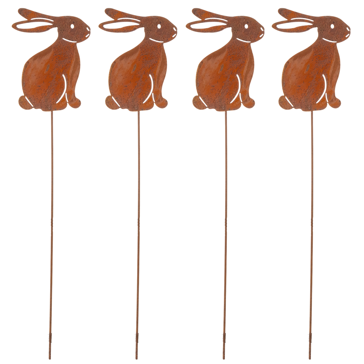 Tuinkonijn op een paaltje voor paasdecoratie met een roestige afwerking in landhuisstijl, 60 cm, 4 stuks