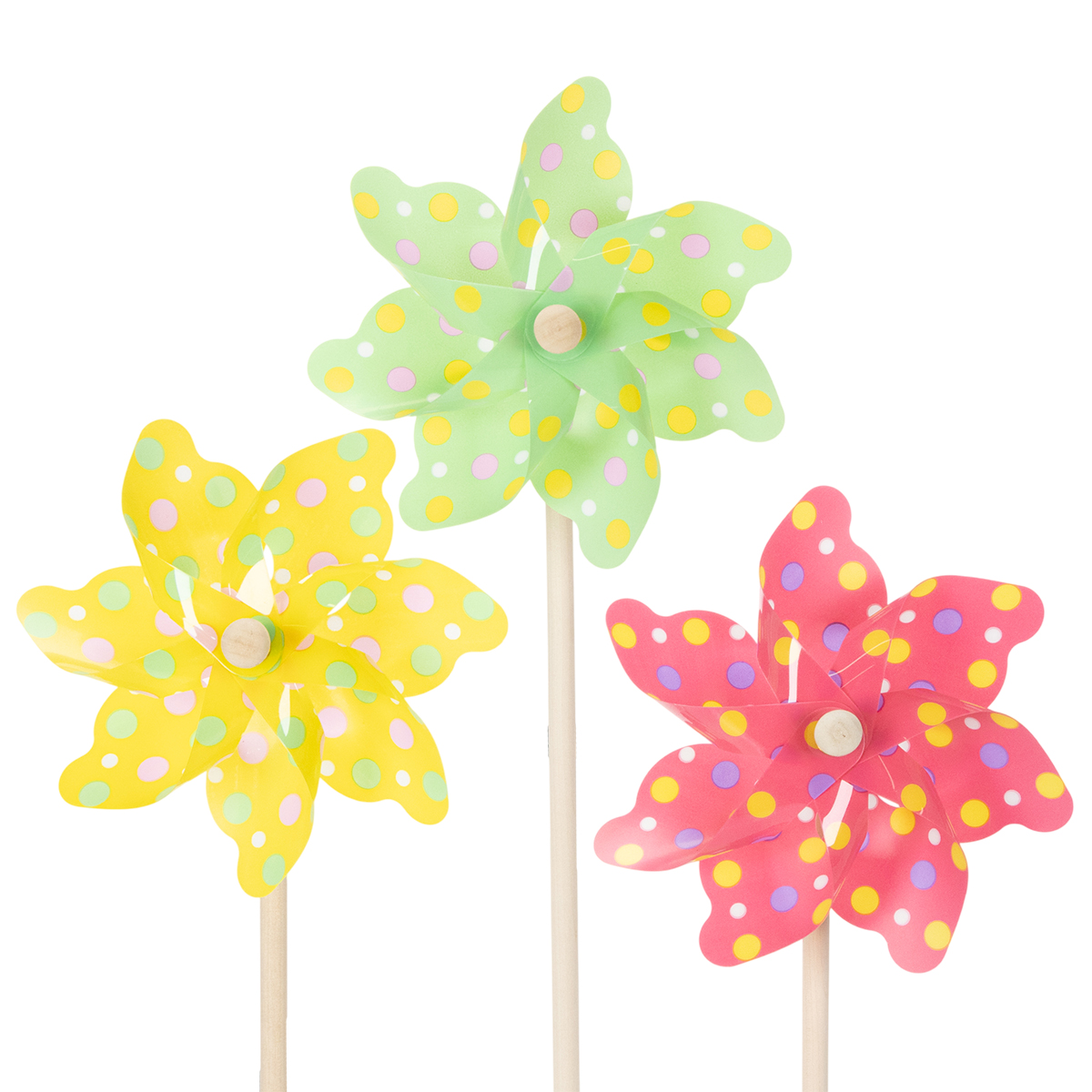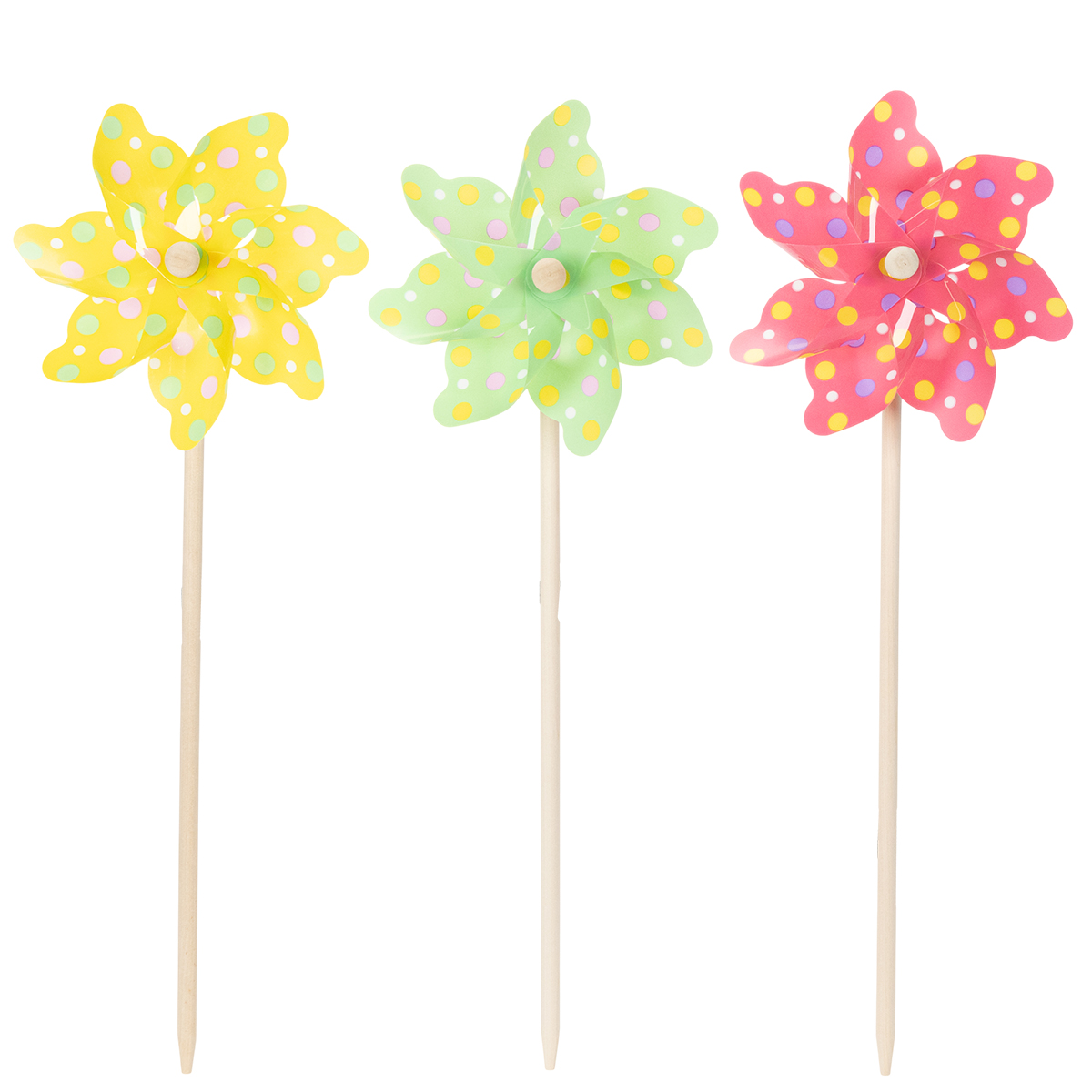 Met een totale hoogte van 47 cm en een diameter van 17 cm hebben deze windmolentjes de perfecte afmetingen om tussen bloemen en planten te plaatsen. Het robuuste plastic in combinatie met een stevige houten paal zorgt voor duurzaamheid. En het mooiste is: je krijgt een set van drie, zodat je je creativiteit de vrije loop kunt laten.