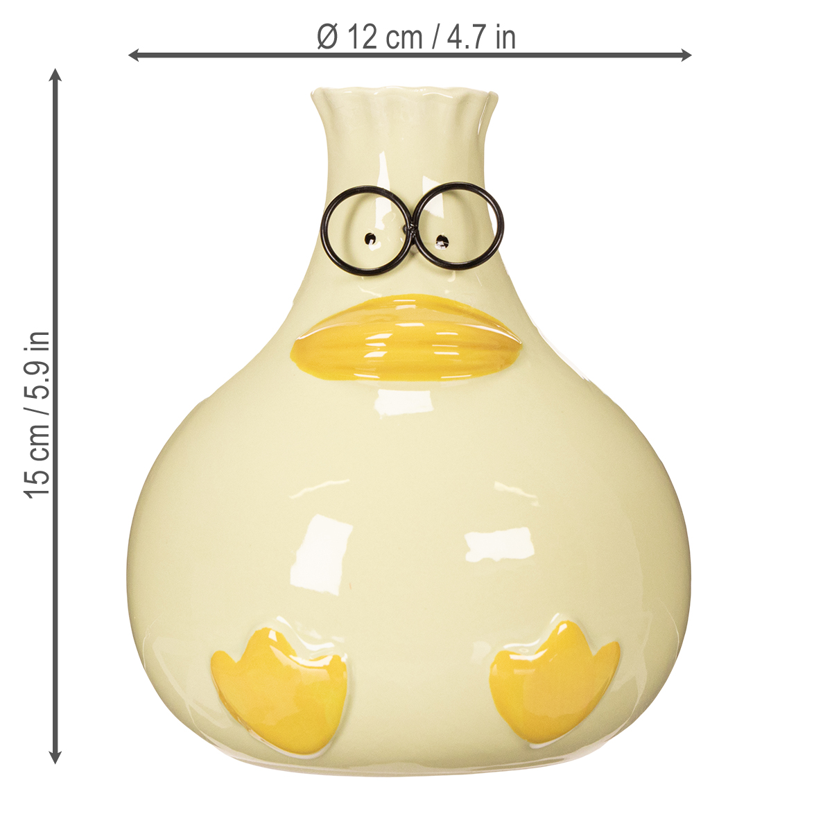 Deze keramische eendvazen combineren een speels ontwerp met hoogwaardig vakmanschap. Met een hoogte van 15 cm en een diameter van 12 cm zijn ze niet te groot en niet te klein, waardoor ze veelzijdig inzetbaar zijn. De robuuste keramische voet straalt niet alleen stabiliteit uit, maar brengt met zijn zachtgele kleur ook een vrolijke levendigheid in elke ruimte. Het moderne ontwerp past naadloos in diverse interieurstijlen, van minimalistisch en Scandinavisch tot speels en charmant voor een kinderkamer.