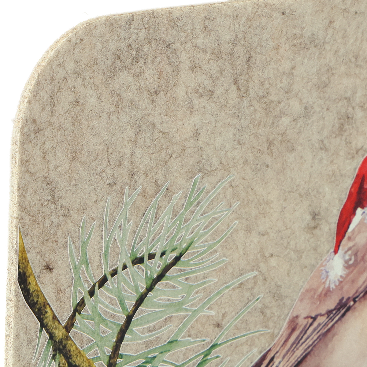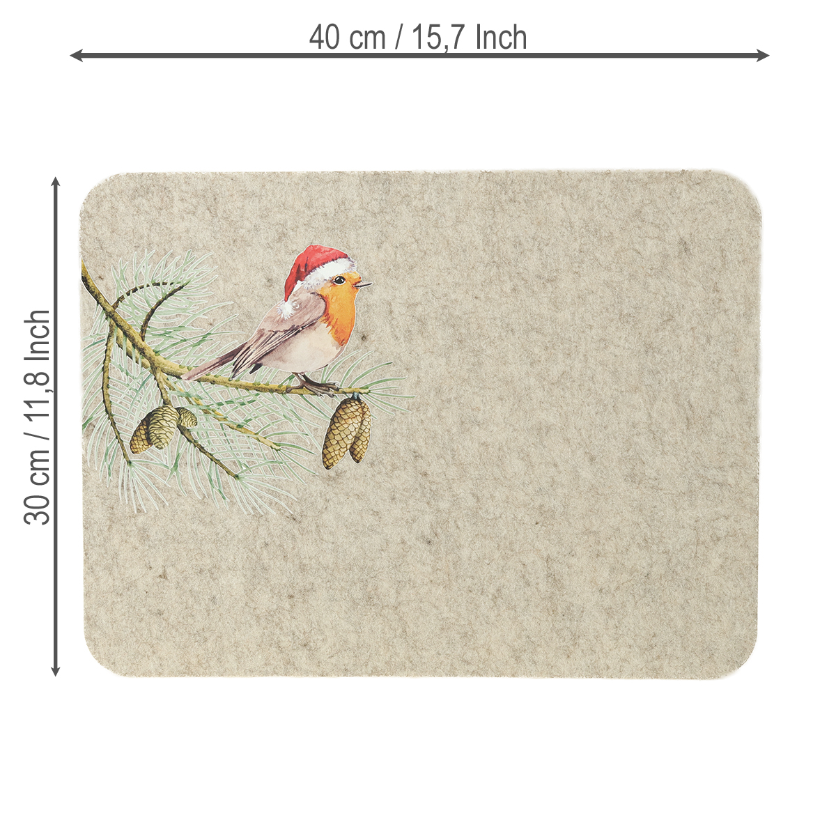Deze placemat is de perfecte keuze voor iedereen die een gezellige maar elegante sfeer wil creëren. Gemaakt van hoogwaardig beigegrijs vilt, heeft de onderzetter een aangename uitstraling en een eenvoudige chique uitstraling die perfect past bij de kerstdecoratie. De print van een roodborstje met een kerstmuts op en zittend op een dennentak is bijzonder innemend. Dit speelse maar stijlvolle motief brengt vrolijkheid op uw tafel zonder al te opdringerig te zijn. De achterkant blijft onbedrukt, waardoor u de mat gewoon met de andere kant naar boven kunt gebruiken – veelzijdige elegantie in één set!