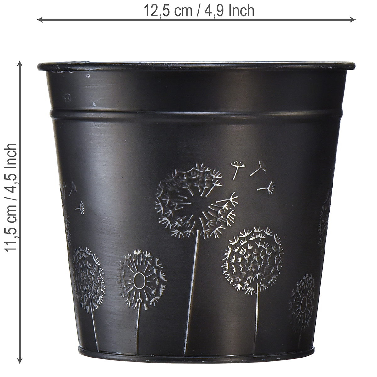 Deze zwarte bloempot is voorzien van een zilverkleurige decoratie die je een zomers gevoel geeft. Paardebloemen zijn er in verschillende maten en stadia. En sommige paraplu's vliegen al naar nieuwe bestemmingen.